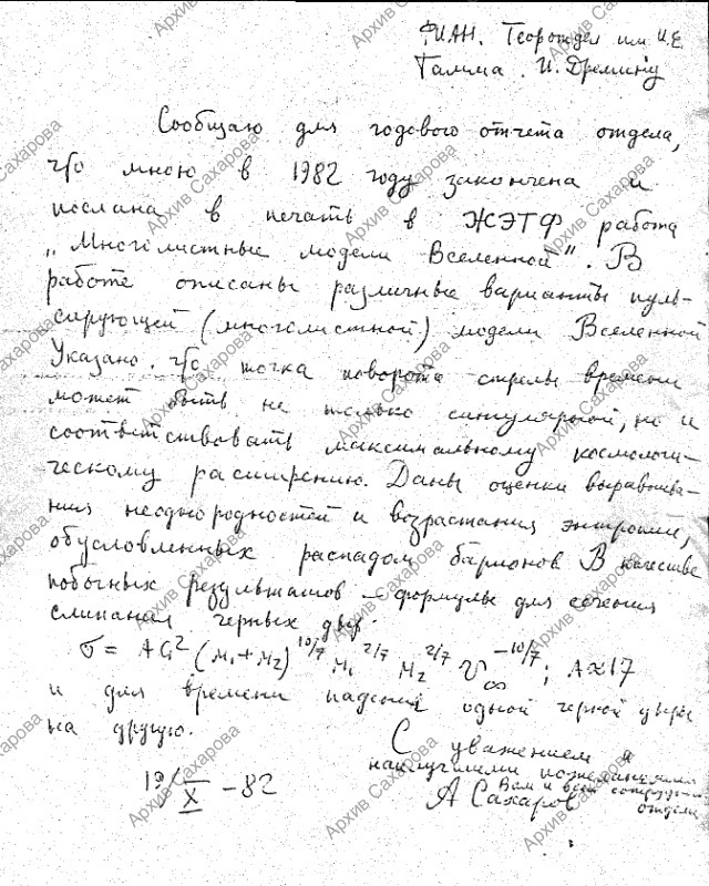 Отчет за 1982 год. Краткое изложение научной работы "Многолистные модели Вселенной"