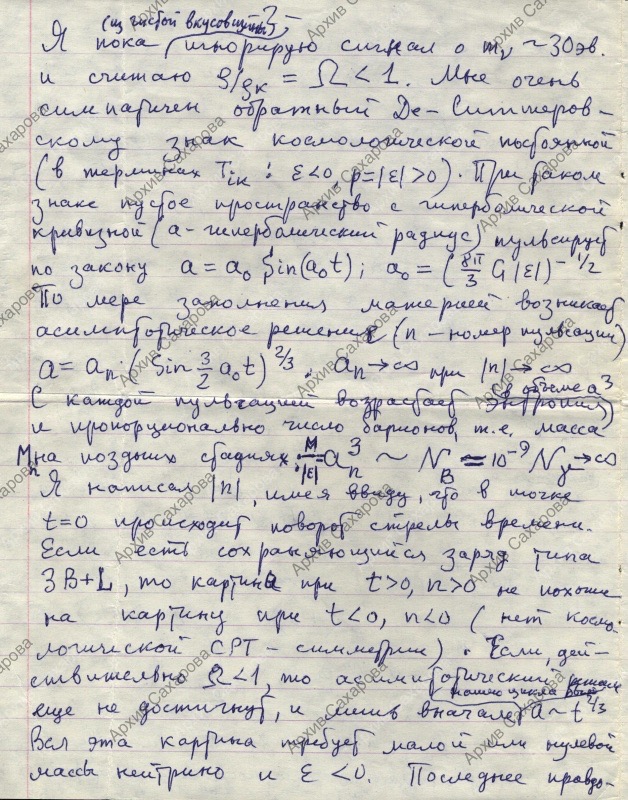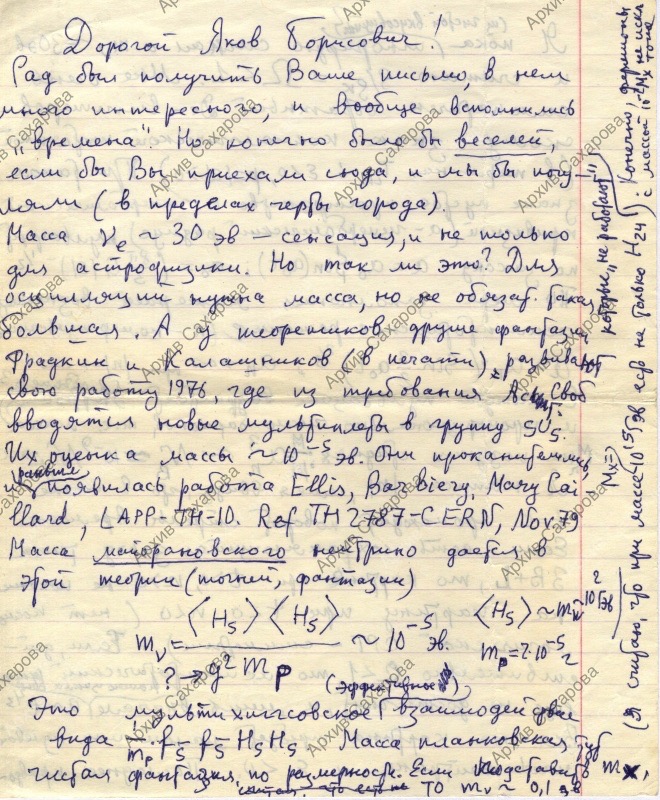 Письмо Зельдовичу Якову Борисовичу с обсуждением научных проблем космологии, в ответ на его письмо