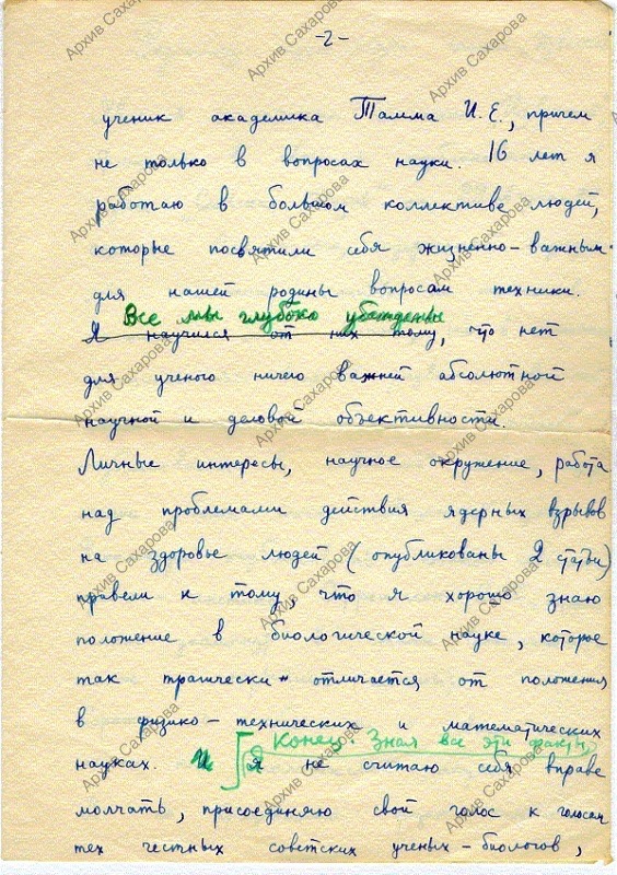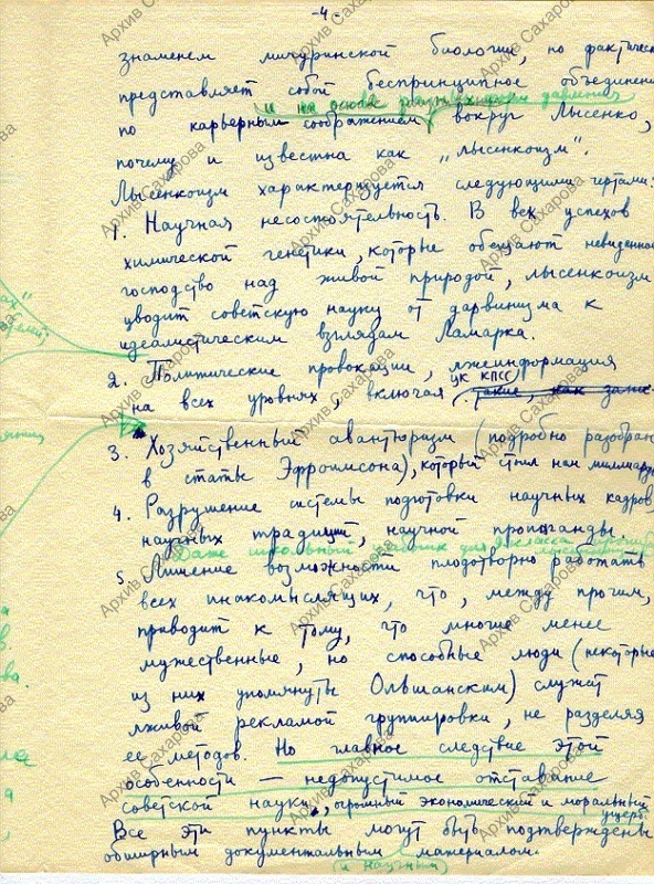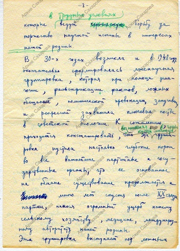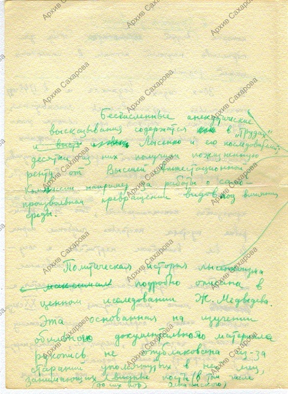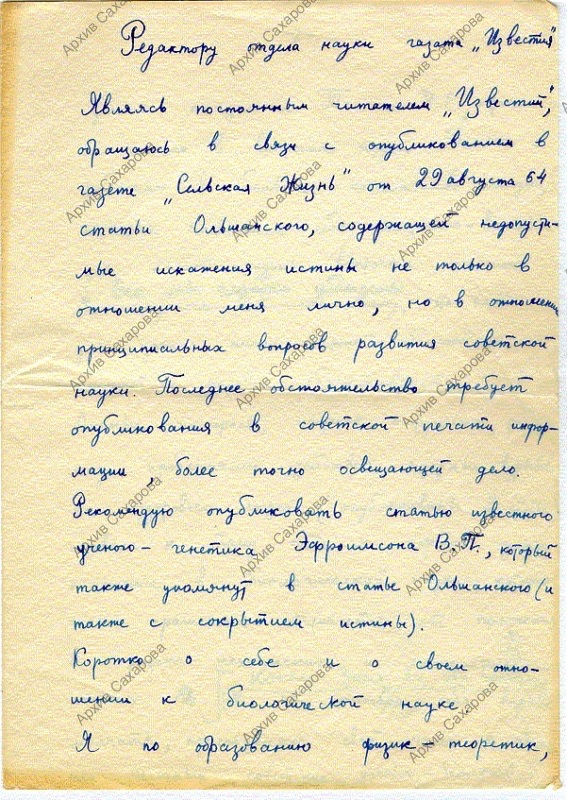 Черновик письма А.Д. Сахарова в газету: ответ президенту Академии сельскохозяйственных наук Ольшанскому М. в связи с публичным обвинением в "клевете"