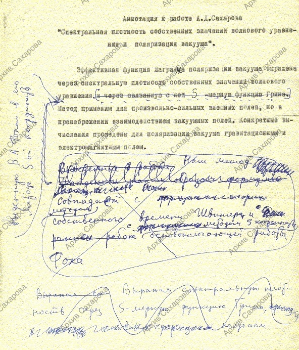 "Аннотация к работе А.Д. Сахарова <<Спектральная плотность собственных значений волнового уравнения и поляризаия вакуума>>"