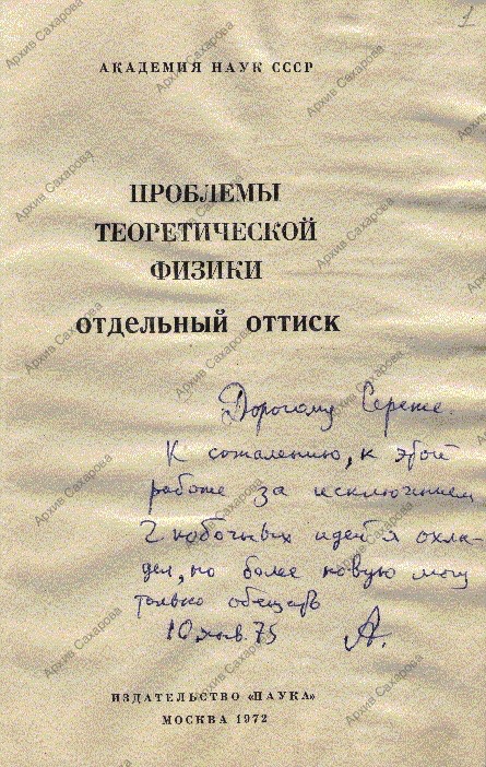 3) на документе дарственная надпись Сахарова "Дорогому Сереже...", сделанная 10.01.1975