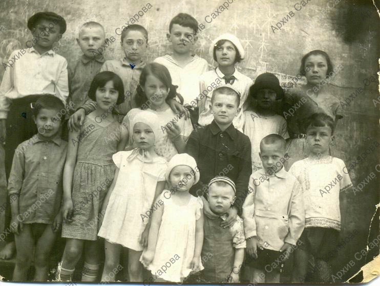 Фотография Андрея, Юры, Иры Сахаровых в группе ребят во дворе дома. Июнь 1933 г.