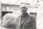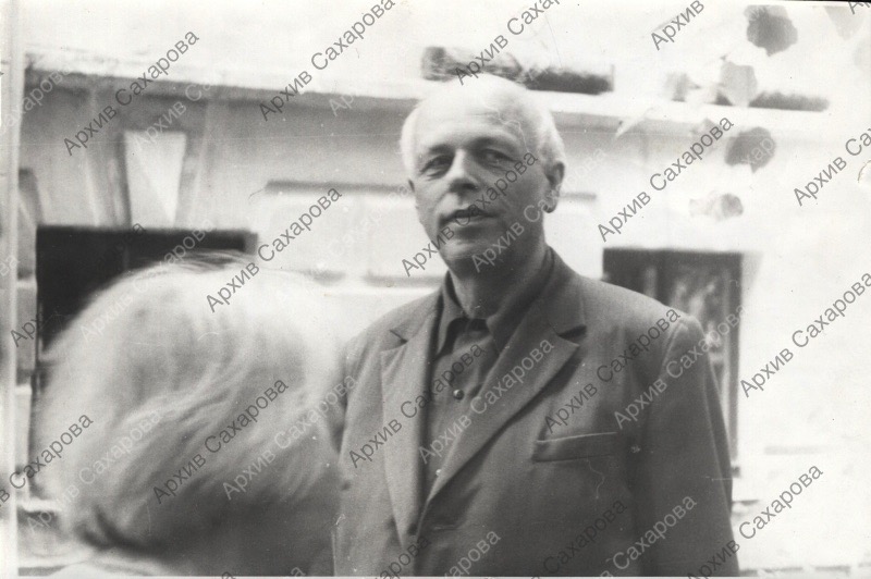 Фотография А.Д.Сахарова с М.Г.Петренко (Подъяпольской) перед зданием суда во время суда над А.И.Гинзбургом в Калуге