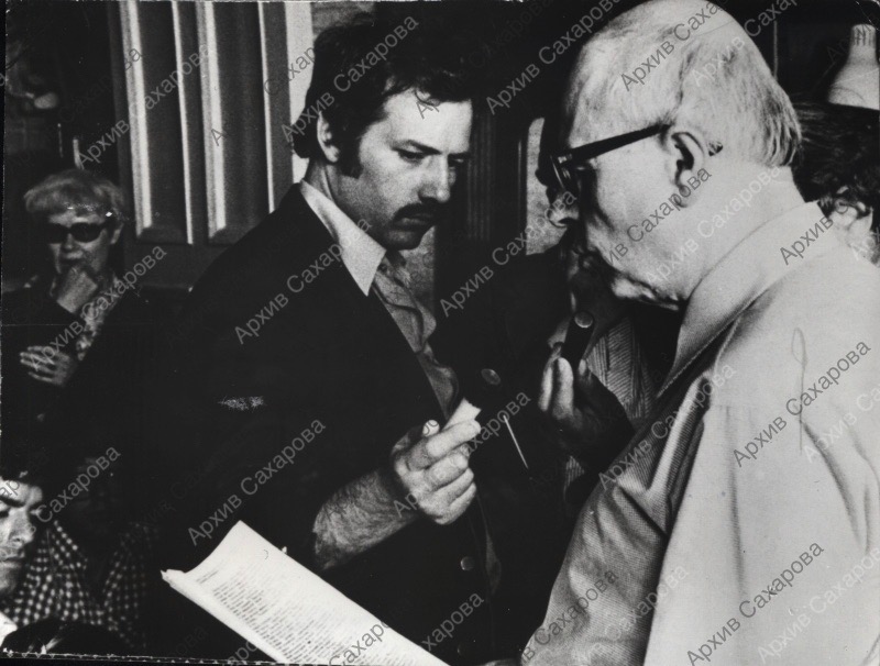 Фотография А.Д.Сахарова во время выступления на пресс-конференции для иностранных корреспондентов, проходившей у него дома