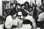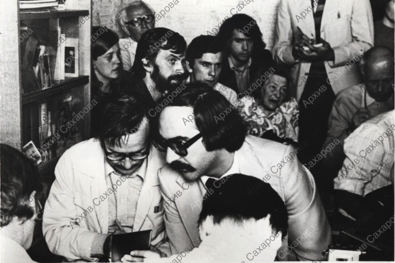Фотография А.Д.Сахарова во время пресс-конференции для иностранных корреспондентов у него дома, в группе людей