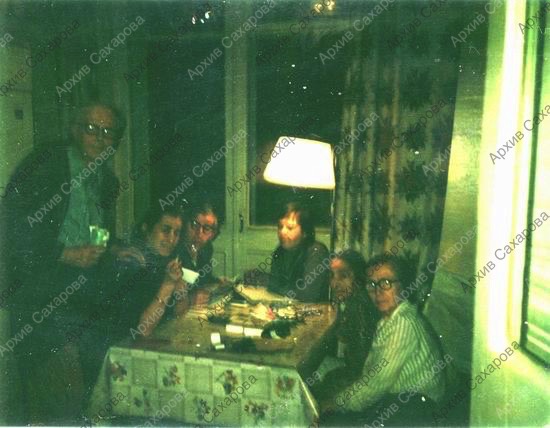 Сидят слева направо: Е.Г.Боннэр, Ю.А.Шиханович, А.П.Плюснина, Р.Г.Боннэр, Ф.В.Голомбик; стоит А.Д.Сахаров