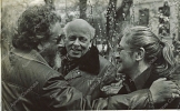 Фотография А.Д.Сахарова и Е.Г.Боннэр с В.Слепаком на улице во время суда над Ю.Ф.Орловым