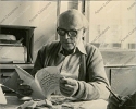 Фотография А.Д.Сахарова с книгой, на кухне