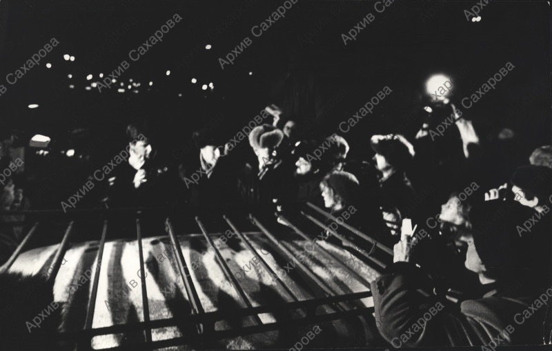 Фотография А.Д.Сахарова около машины на площади Ярославского вокзала после приезда из Горького, в группе журналистов
