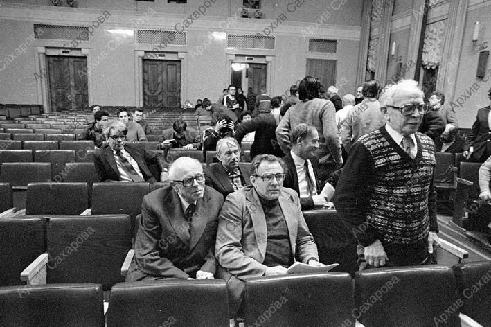 Фотография А.Д.Сахарова, В.Я Файнберга и Я.Л.Альперта на семинаре в ФИАНе, в группе людей