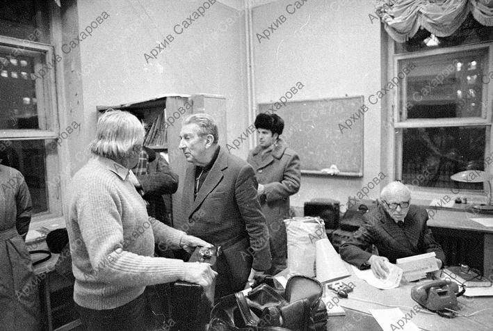 Фотография А.Д.Сахарова в теоротделе ФИАНа, с сотрудниками отдела