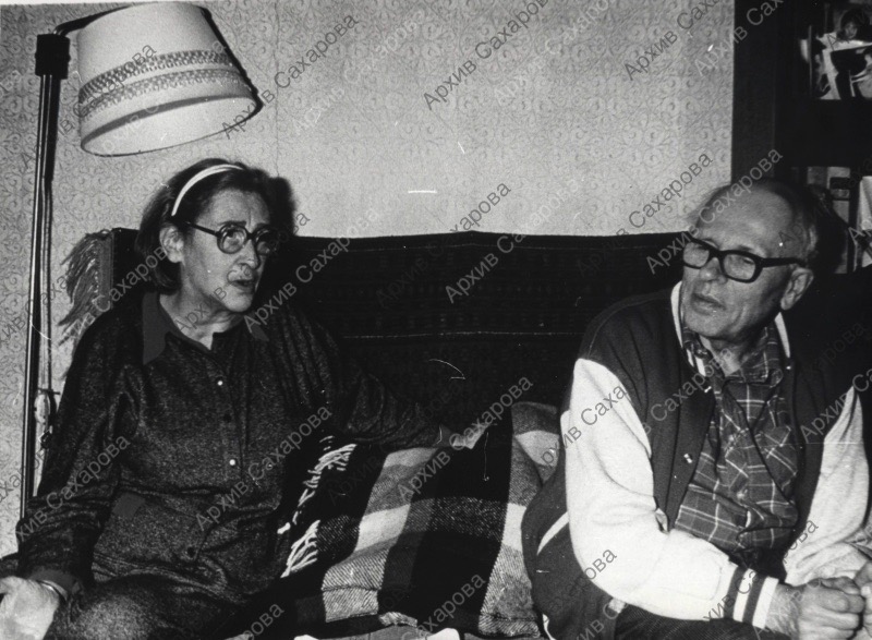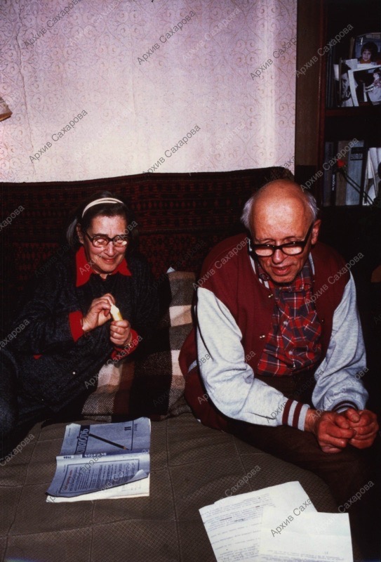 Две фотографии А.Д.Сахарова и Е.Г.Боннэр дома в комнате, сидят на тахте