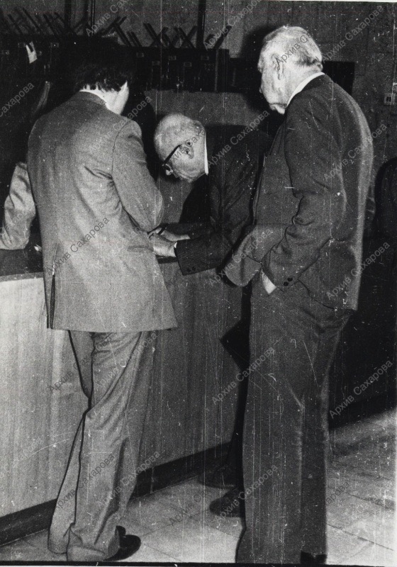 Фотография А.Д.Сахарова во время IV семинара по квантовой гравитации, с двумя неизвестными людьми