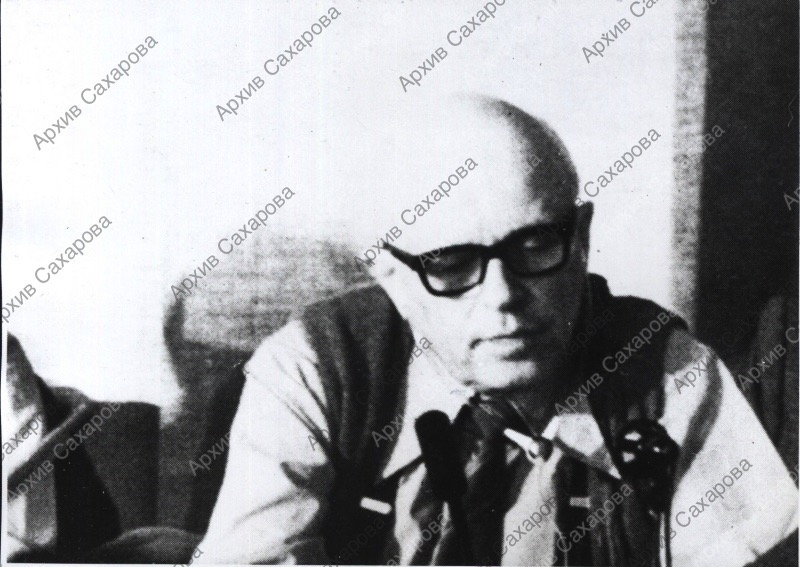 Фотография А.Д.Сахарова на его пресс-конференции во время Международного форума "За безъядерный мир, за выживание человечества"
