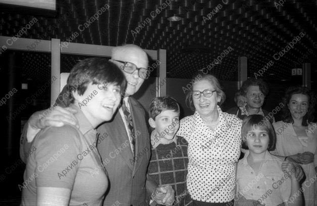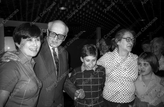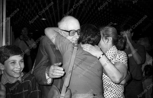 Пять фотографий А.Д.Сахарова и Е.Г.Боннэр во время встречи в аэропорту Шереметьево ее мамы, дочери и внуков