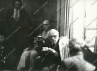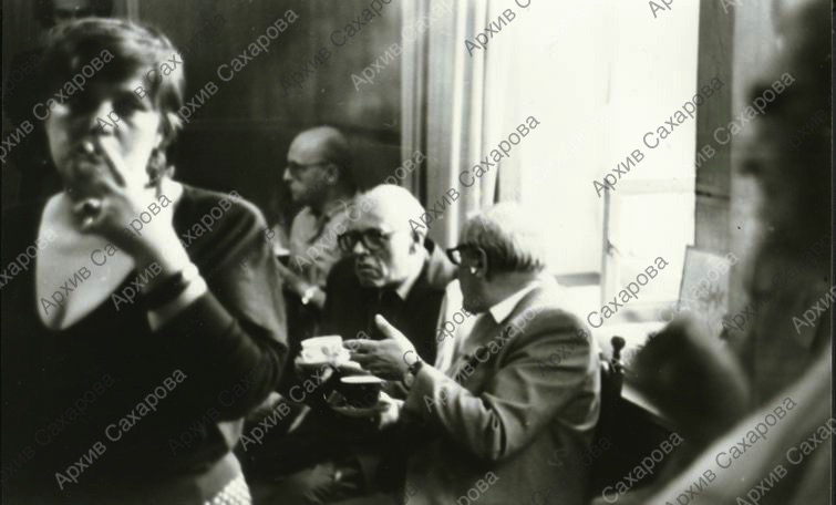 Четыре фотографии А.Д.Сахарова после просмотра спектакля "Собачье сердце" в ТЮЗе, в группах людей