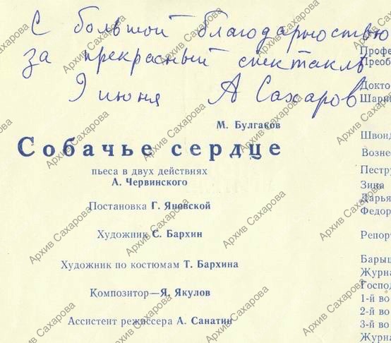 надпись А.Д.Сахарова на программке спектакля - 1 л.