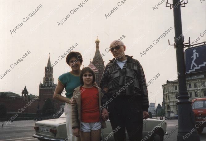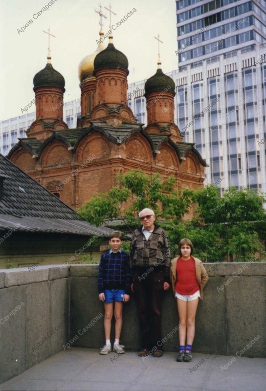 Две фотографии А.Д.Сахарова с Т.И.Янкелевич и ее детьми Аней и Матвеем во время прогулки по Москве, на ул.Разина и на Красной площади