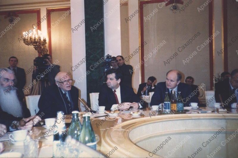 Фотография А.Д.Сахарова во время встречи с М.С.Горбачевым директоров Международного фонда "За выживание и развитие человечества", в группе людей
