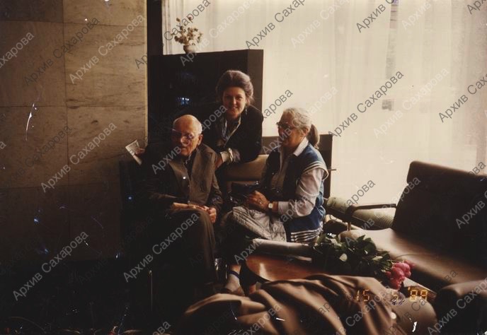 Фотография А.Д.Сахарова и Е.Г.Боннэр с неизвестной в холле гостиницы в Пицунде
