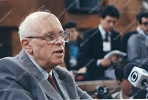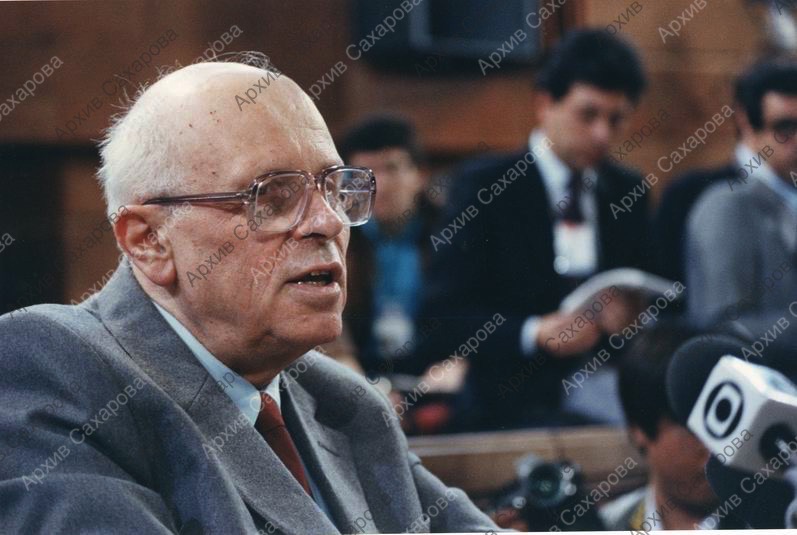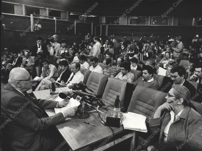 Две фотографии А.Д.Сахарова во время его пресс-конференции в пресс-центре МИДа, перед журналистами