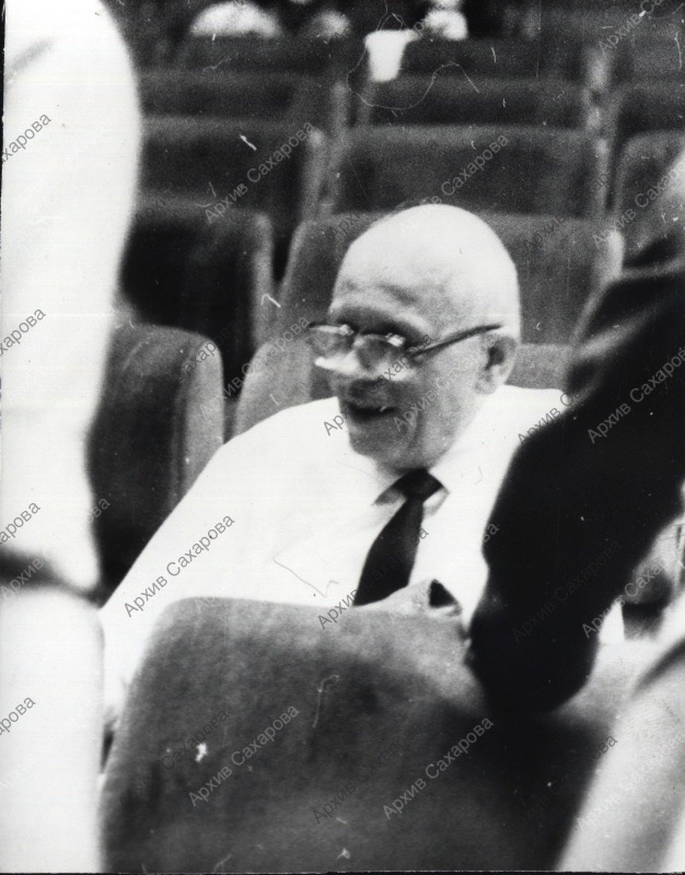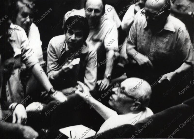 Две фотографии А.Д.Сахарова в зале на конференции, посвященной 100-летию А.А.Фридмана, в группе людей