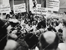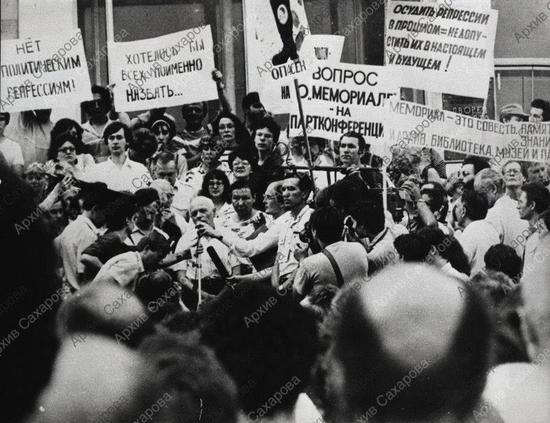 Фотография А.Д.Сахарова во время выступления на митинге в поддержку создания общества "Мемориал", в группе людей