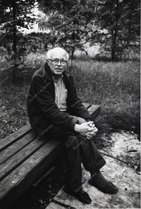 Фотография А.Д.Сахарова на скамейке в пансионате в Протвино