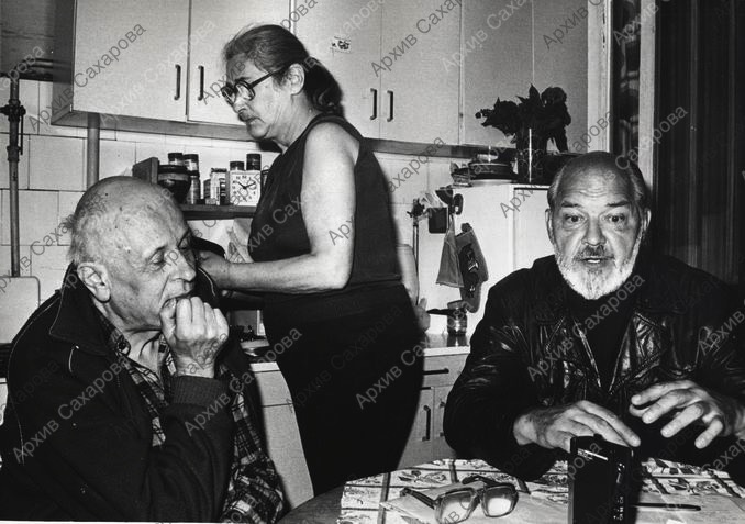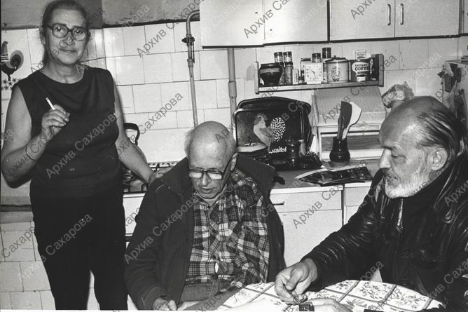 Две фотографии А.Д.Сахарова и Е.Г.Боннэр с Ю.Ф.Карякиным, дома на кухне