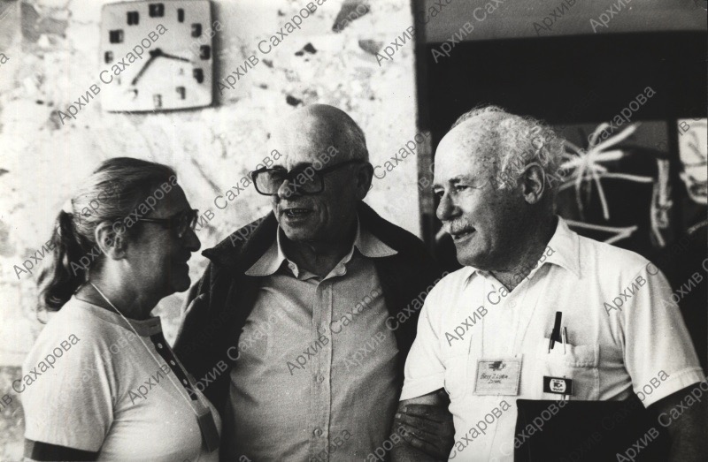 Фотография А.Д.Сахарова и Е.Г.Боннэр с Г.Липкиным во время 38-й Пагуошской конференции в Дагомысе