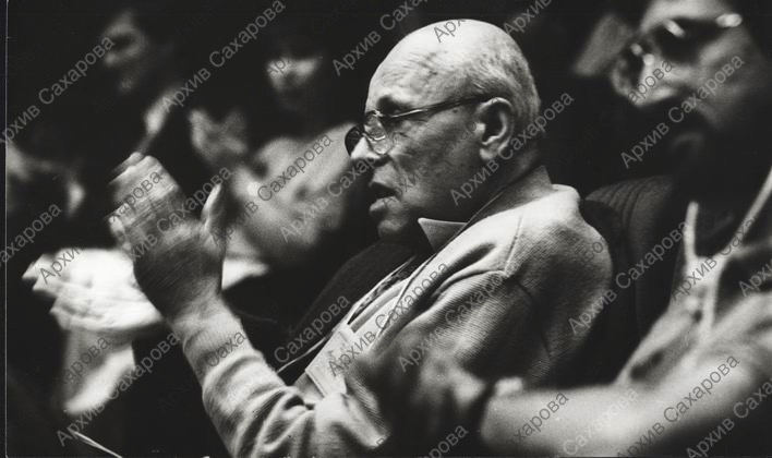 Фотография А.Д.Сахарова на заседании 38-й Пагуошской конференции в Дагомысе, в группе людей