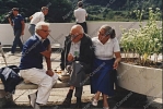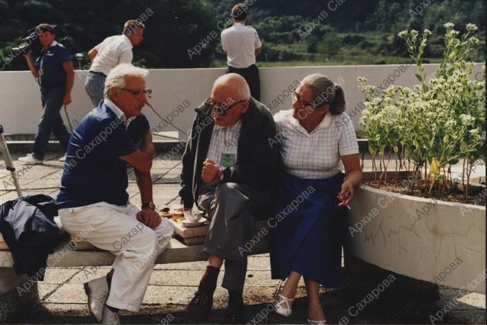 Фотография А.Д.Сахарова и Е.Г.Боннэр около гостиницы во время 38-й Пагуошской конференции в Дагомысе, с неизвестным