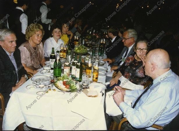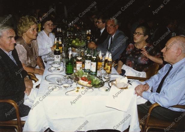 Сидят слева - Д.Гранин, Н.Г.Арцимович; справа - Сахаров, Боннэр, Т.Тейлор