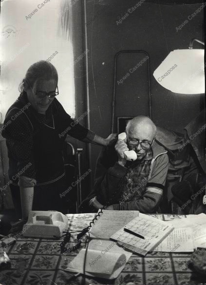 Фотография А.Д.Сахарова (разговаривает по телефону) и Е.Г.Боннэр на кухне во время ремонта