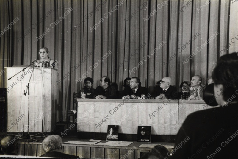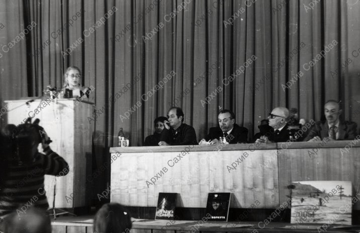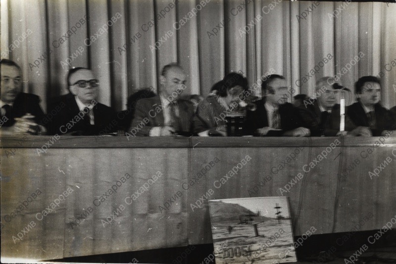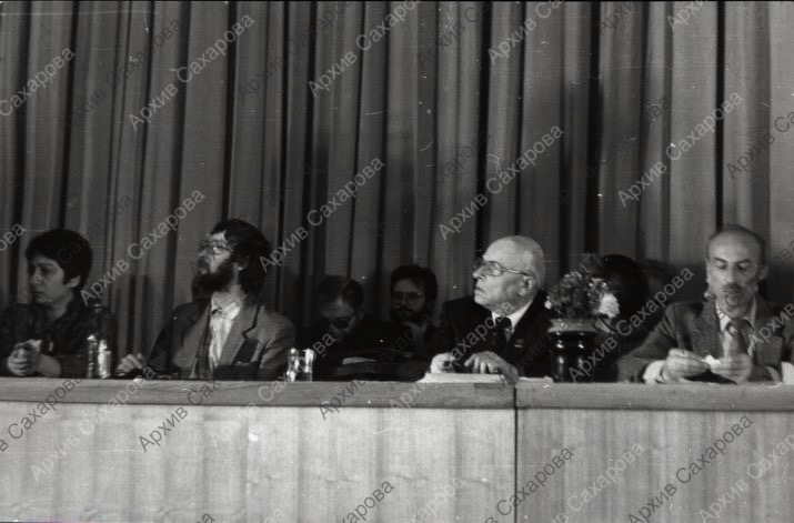 Первое фото слева направо: Сахаров, В.Л.Глазычев, А.С.Смирнов (стоит), Ю.Б.Соловьев, Ю.П.Платонов; третье и четвертое фото - выступает Е.Г.Боннэр