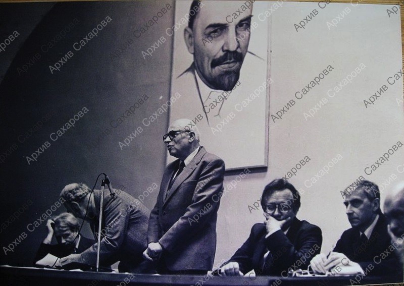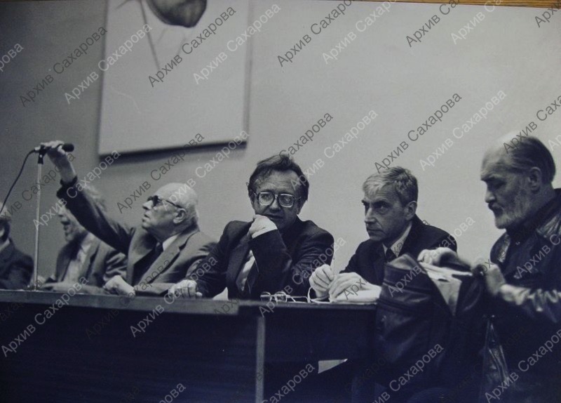 Две фотографии А.Д.Сахарова во время выступления на первом заседании дискуссионного клуба "Московская трибуна" в Московском историко-архивном институте, с членами президиума