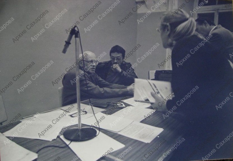 Фотография А.Д.Сахарова, Ю.М.Роста и Е.Г.Боннэр на первом заседании дискуссионного клуба "Московская трибуна" в Московском историко-архивном институте