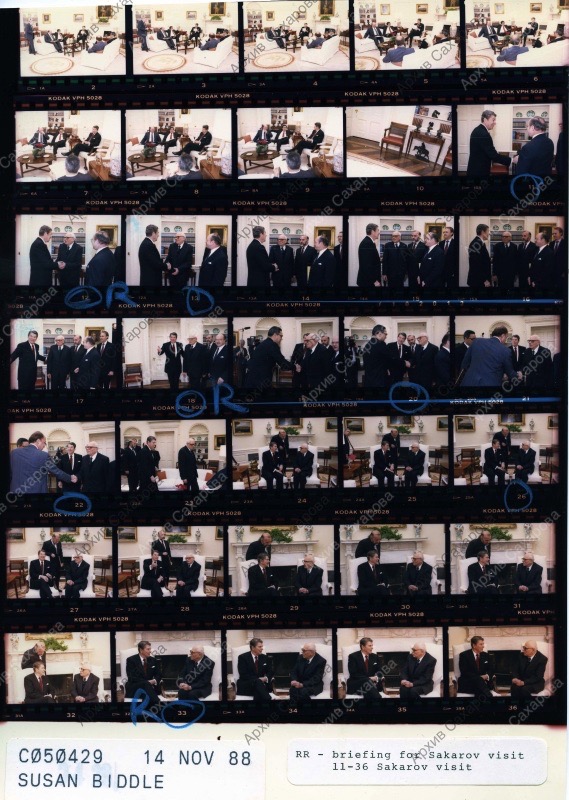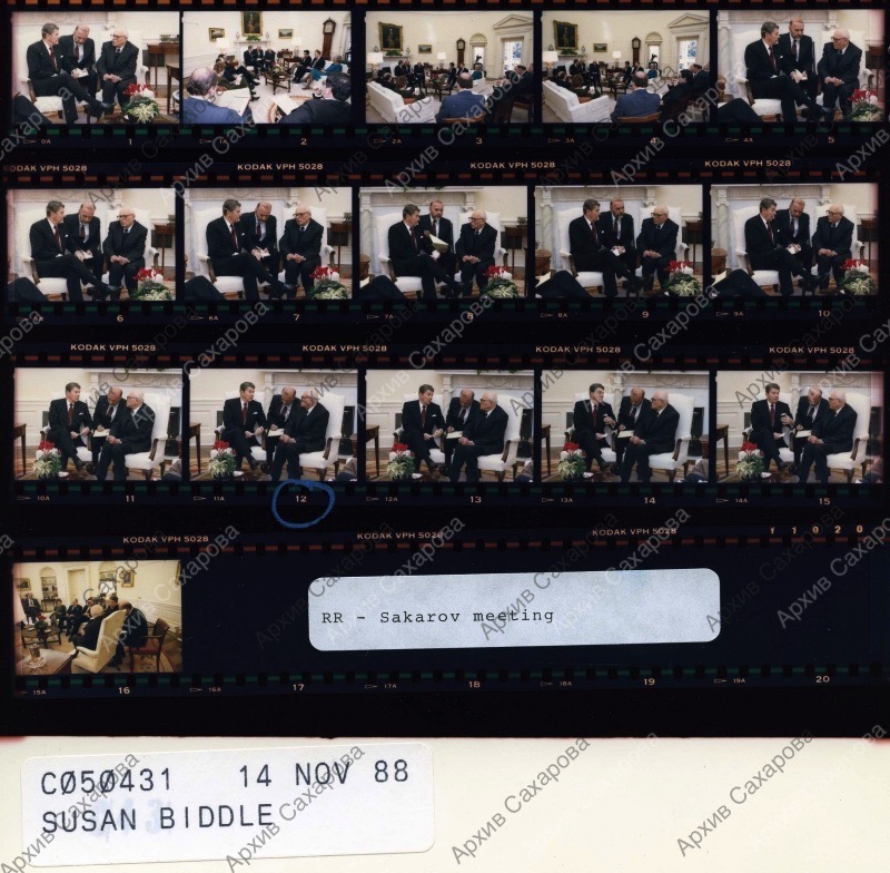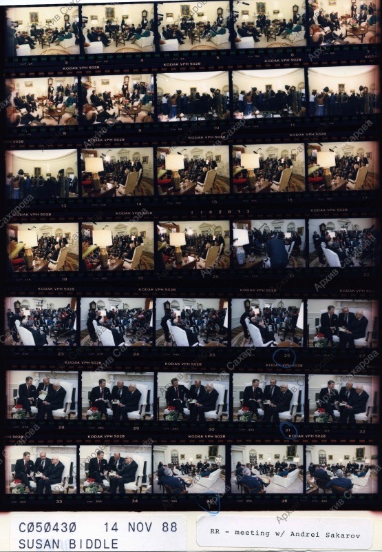 Три листа с контрольными отпечатками фотографий встречи А.Д.Сахарова с президентом США Р.Рейганом в Белом доме