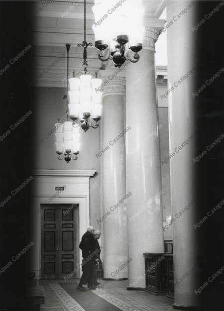 Фотография А.Д.Сахарова и А.Б.Мигдала в фойе Главного здания МГУ во время Общего собрания АН СССР