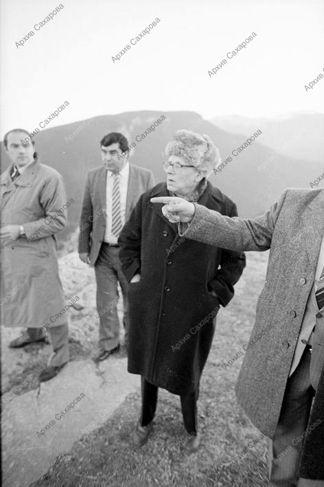 Фотография А.Д.Сахарова в горах во время поездки в Карабах или в район землетрясения в Армении, в группе людей