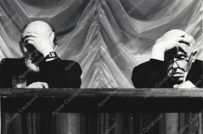Фотография А.Д.Сахарова и Ю.Ф.Карякина в президиуме Учредительной конференции общества "Мемориал"