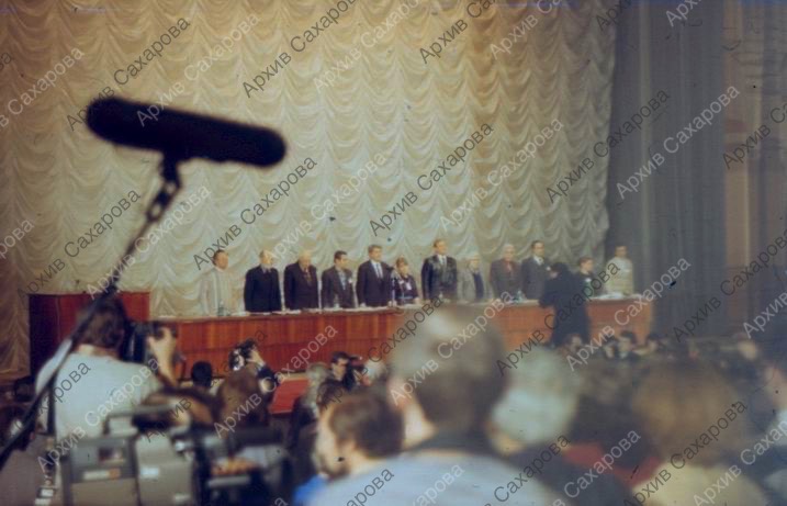 В президиуме слева направо: А.Адамович, Ю.Карякин, Сахаров, Л.Пономарев, Ю.Афанасьев, Е.Жемкова, Е.Евтушенко, неизвестные