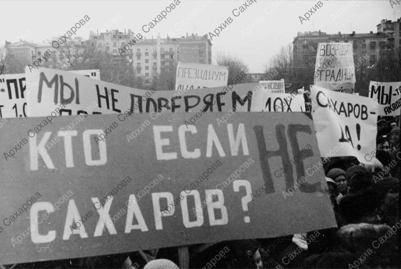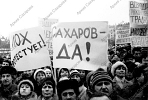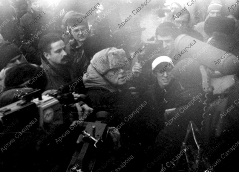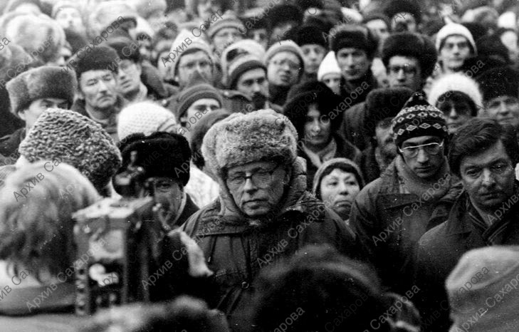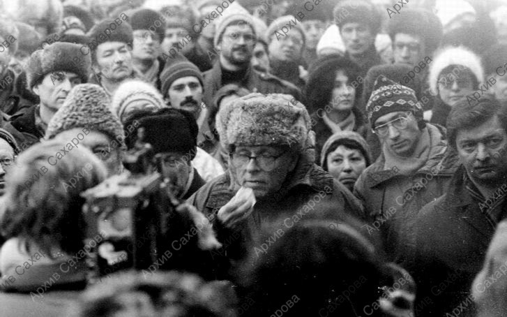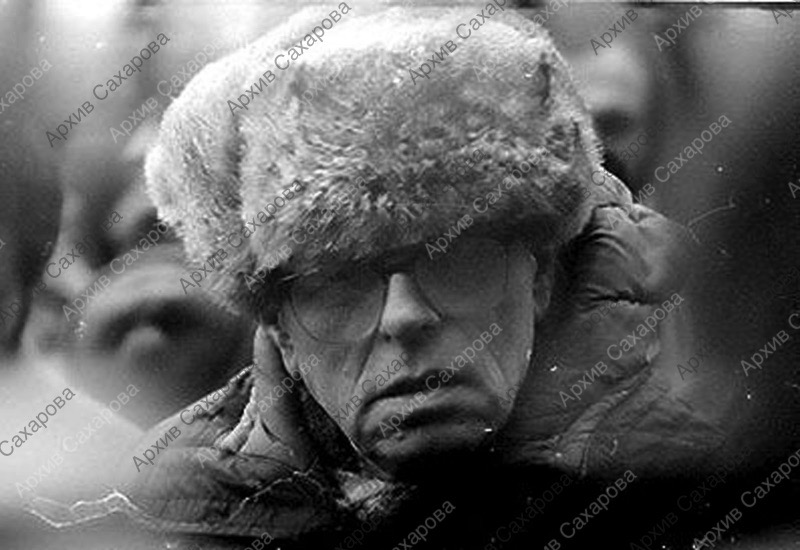 Пять фотографий А.Д.Сахарова среди участников митинга перед зданием Президиума АН СССР