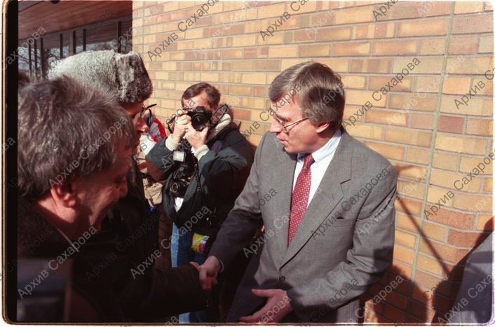 Шесть фотографий А.Д.Сахарова и Е.Г.Боннэр около редакции газеты Ottawa Citizen перед ее посещением, в группах людей