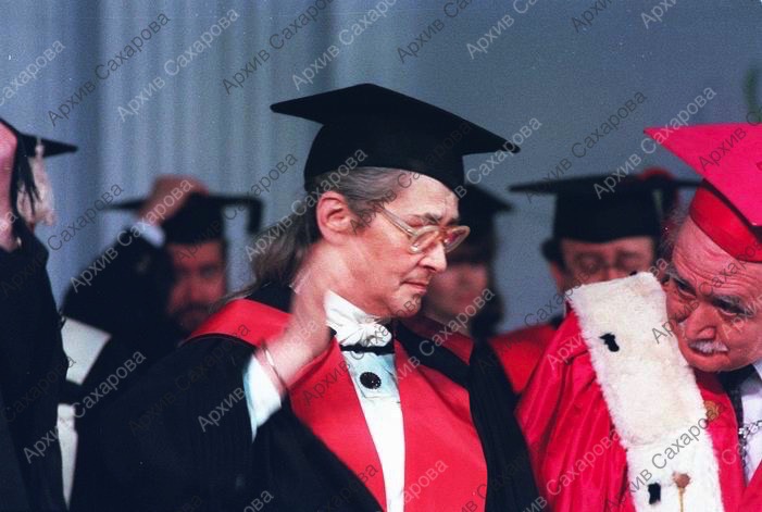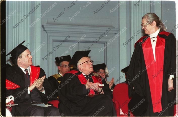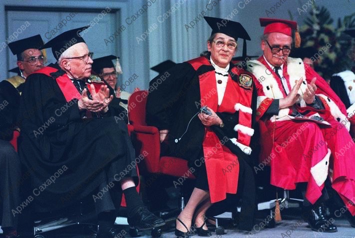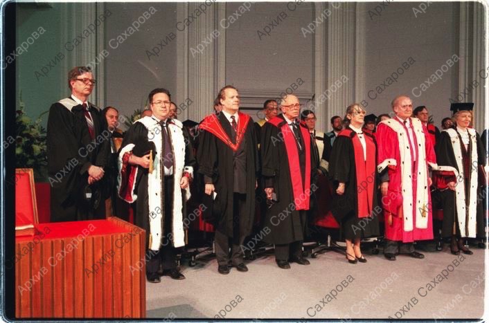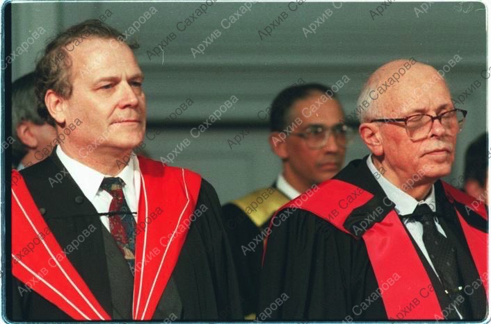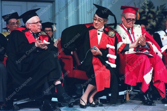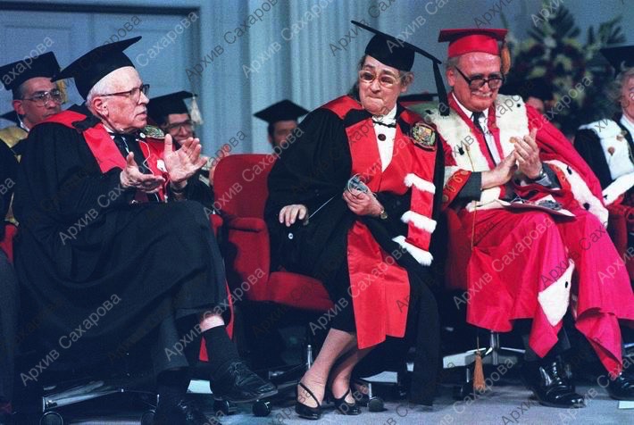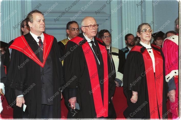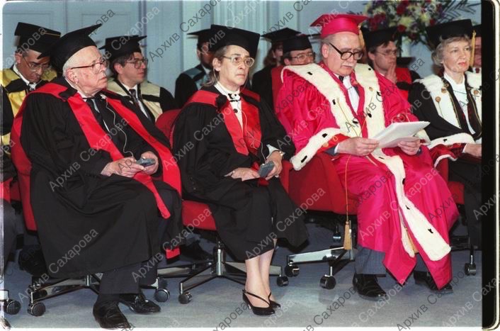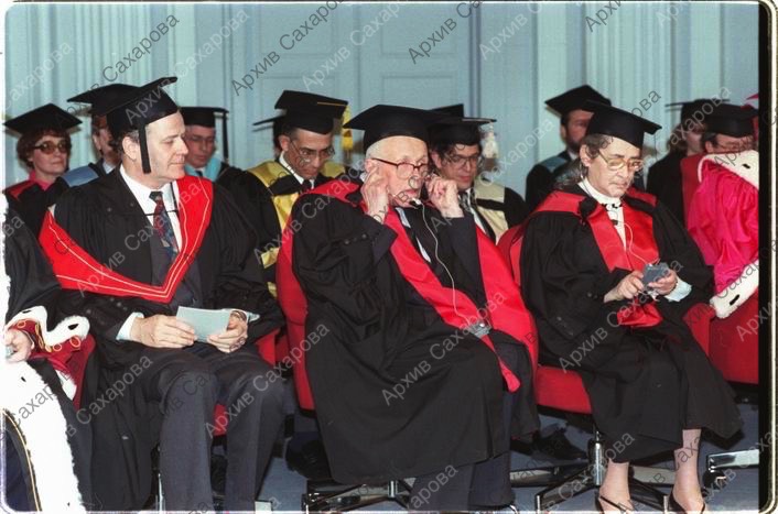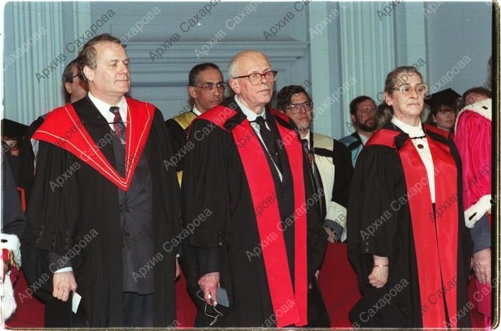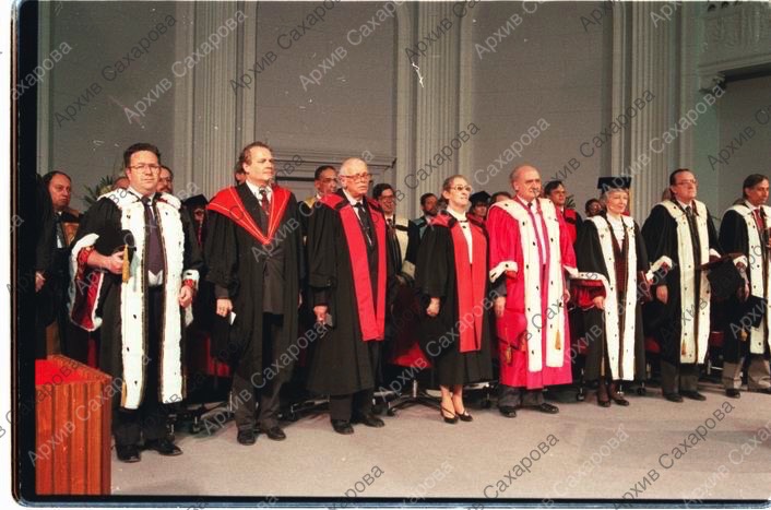 Двадцать семь фотографий А.Д.Сахарова и Е.Г.Боннэр в университете Оттавы на церемонии утверждения почетных докторантов и возложении регалий, в группах людей