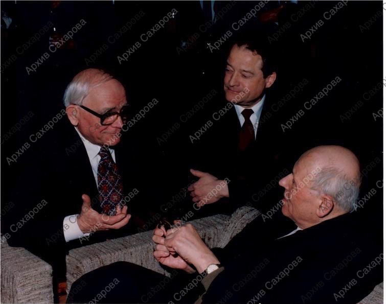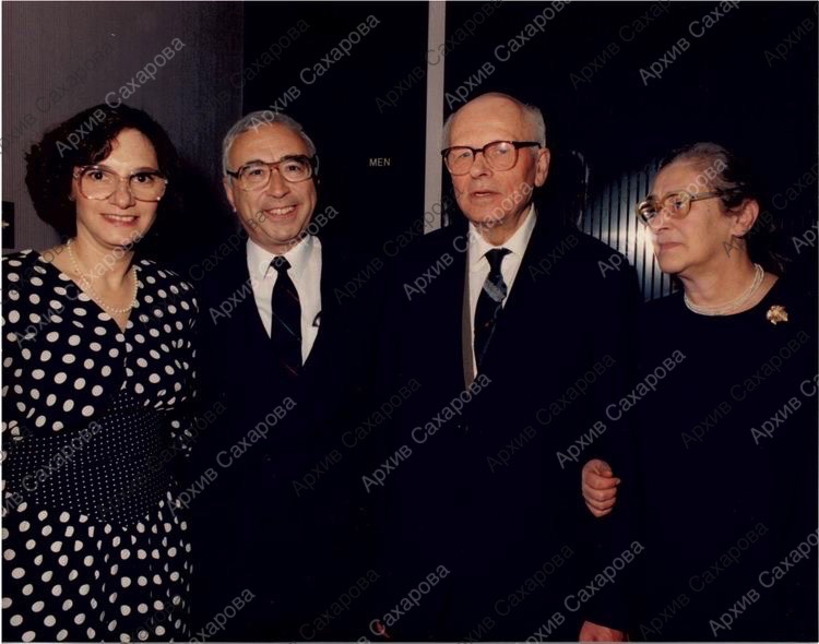 Две фотографии А.Д.Сахарова (на одной с Е.Г.Боннэр) во время торжественного обеда с презентацией премии Исследовательского фонда госпиталя Св. Бонифация и диплома почетного гражданина Виннипега, в группах людей