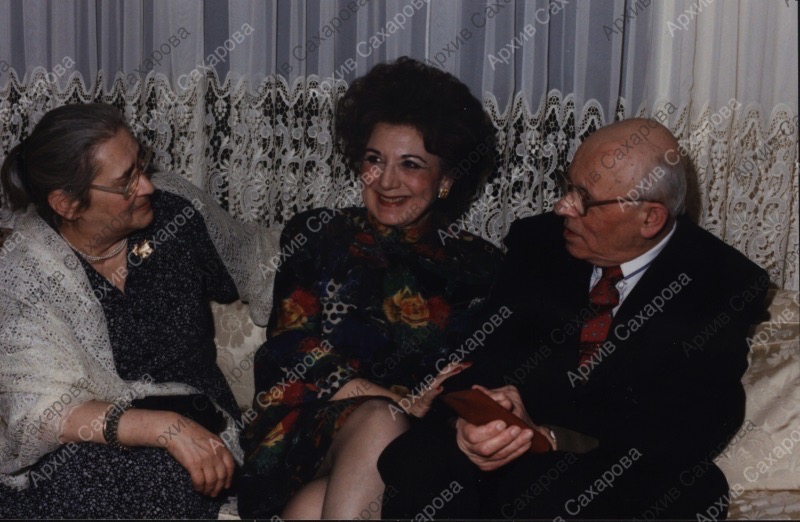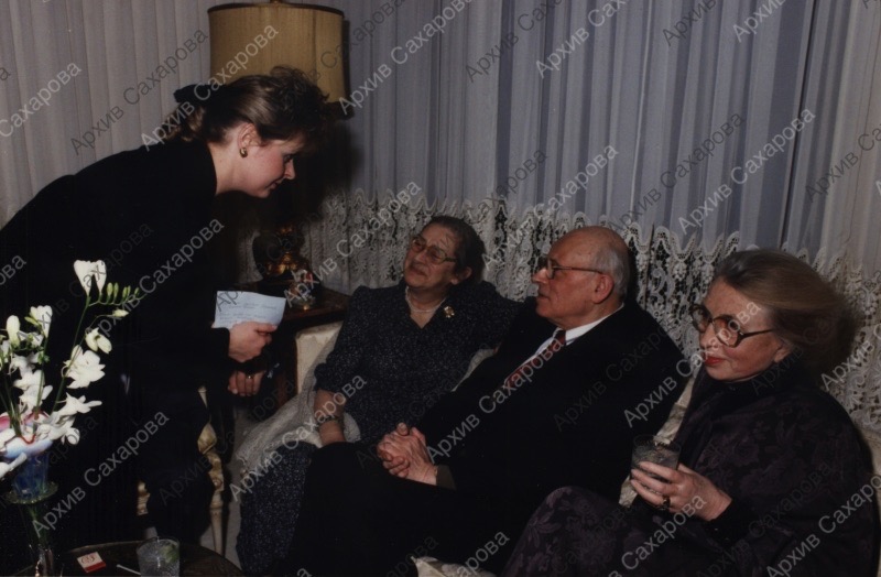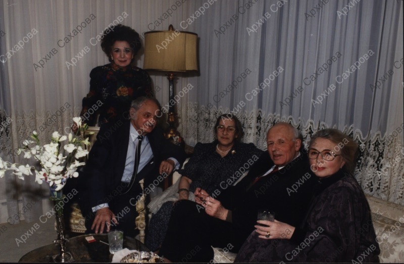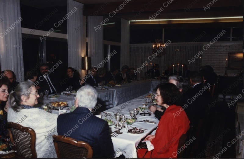 Четыре фотографии А.Д.Сахарова и Е.Г.Боннэр во время частного обеда в их честь, в группах людей