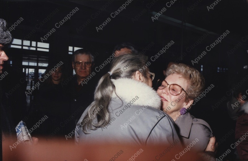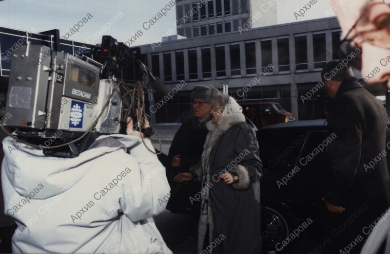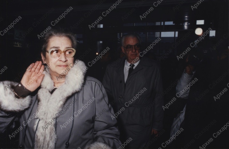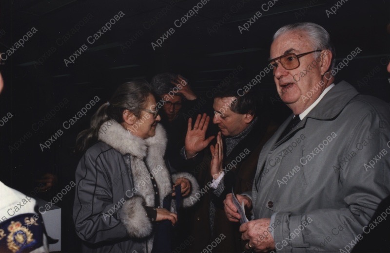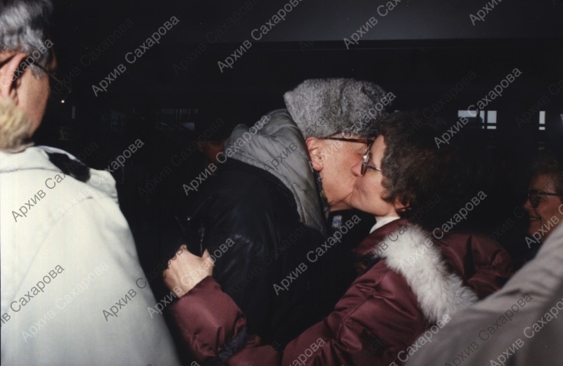 Шесть фотографий А.Д.Сахарова и Е.Г.Боннэр перед отлетом из Виннипега в Бостон, в группах людей