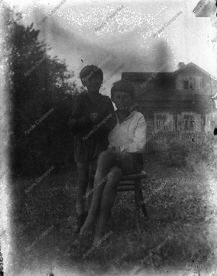 Фотография Андрея и Юры Сахаровых на фоне деревенского дома. 1932-1933 гг.(?)