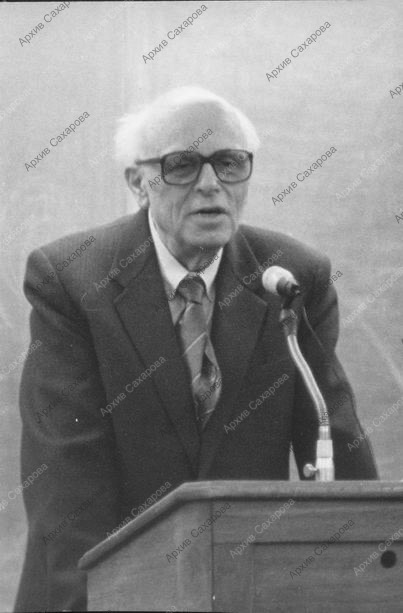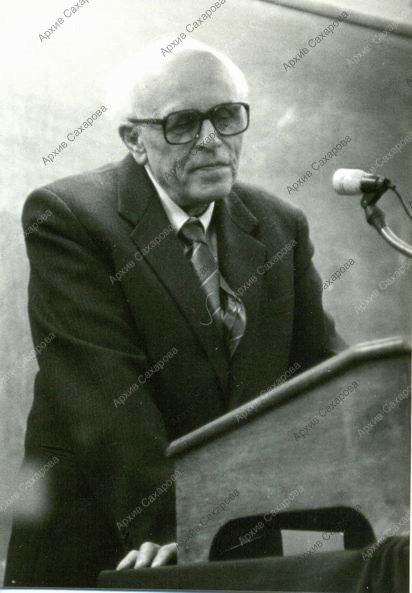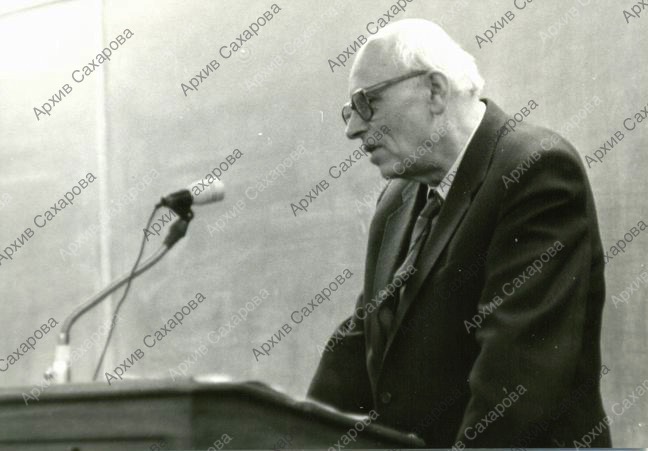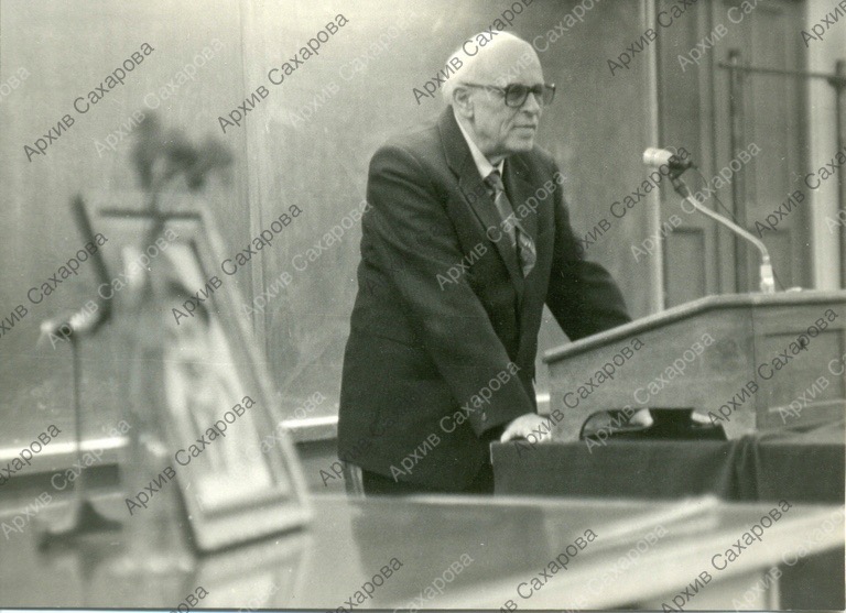 Четыре фотографии А.Д.Сахарова во время выступления на физфаке МГПИ на вечере, посвященном 100-летию со дня рождения Д.И.Сахарова